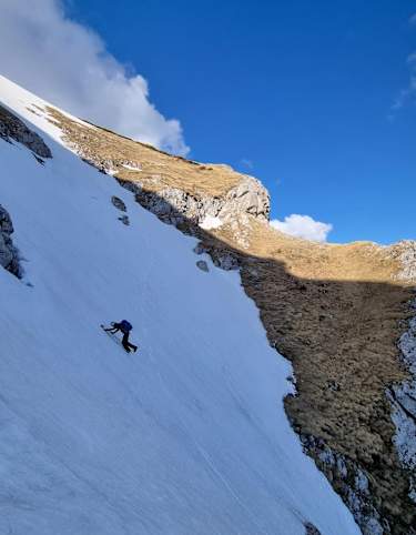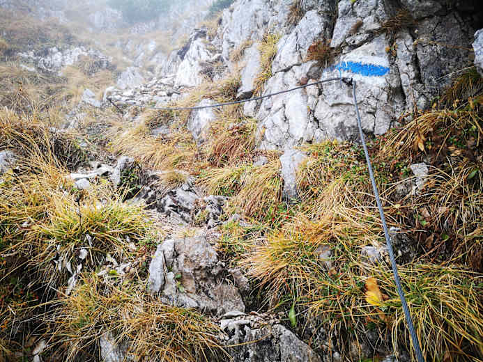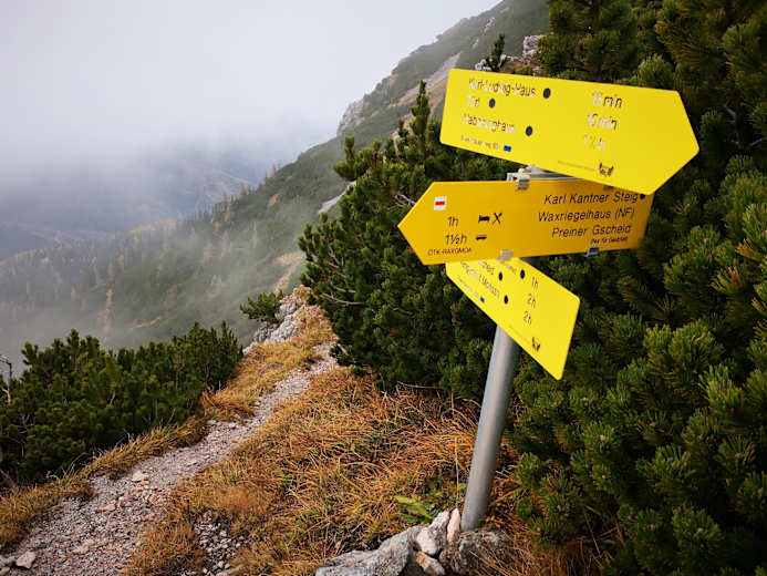 Am Preiner Gscheid halten wir uns zunächst leicht links aufwärts in Richtung Reißtalerhütte / Reißtalersteig (gelbe Markierung, Hinweistafel). Vor der unbew. Hütte folgen wir dem Gretchensteig rechts aufwärts (ab hier etwas steiler) bis knapp unterhalb der Baum / Latschengrenze. Hier zweigt rechts blau markiert der Raxenmäuersteig ab und führt uns, immer schräg aufwärts, unterhalb der Felswände, bis zu einer versicherten Kletterstelle (nicht allzu schwierig). Ein paar Stahlseile helfen uns hier aufwärts und bald stehen wir auf der Kreuzung mit dem vom Schlangenweg heraufkommenden und ebenfalls versicherten Karl Kantnersteig.