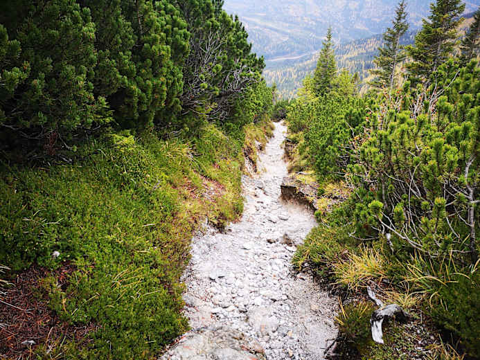 Am Waxriegelsteig treffen sich der Bismarcksteig und der Wanderweg über den Predigtstuhl wieder. Gemeinsam geht es über den teilweise etwas ausgewaschenen, aber unschwierigen Wanderweg abwärts bis zum Waxriegelhaus.