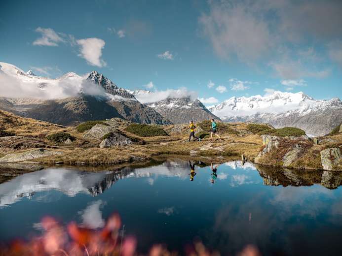 Danach wandern Sie bergab auf die Bettmeralp, weiter in Richtung Alpmatten und Martisberg zum Feriendorf in Fiesch. Dort überqueren Sie die Rhone, passieren die malerischen Dörfer Ernen und Mühlebach und wechseln über die Goms-Bridge wieder ans andere Ufer.