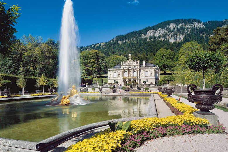 Nördlich an Graswang vorbei wandern Sie ins Kohlbachtal und erreichen über die Forststraße bald Schloss Linderhof. Die Kasse für den Schlosseintritt befindet sich jenseits des Parks. Den Park selbst können Sie aber kostenlos besichtigen.