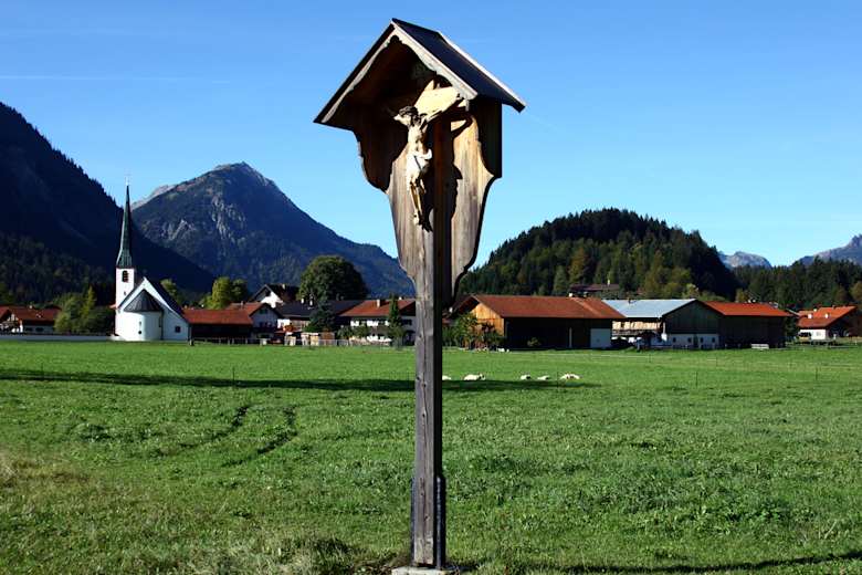 Nach Überqueren der Arme-Seelen-Straße, von Oberammergau nach Graswang, führt der Wanderweg als Wiesenweg beständig am Fuß des Sonnenbergs entlang zu den Rahmbauernhöfen.