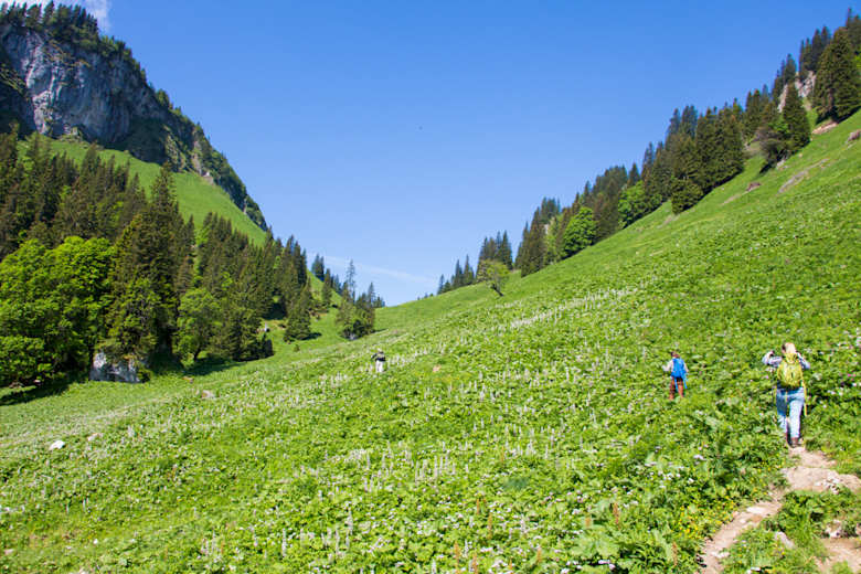 Über Wiesen mit altem Laubbaumbestand erreichen Sie den Bäckenalmstattel. Nach rechts abbiegend würden Sie über den Feigenkopf zur Großen Klammspitze gelangen, oder geradeaus zur Kenzenhütten. Sie nehmen aber den linken Bergpfad.