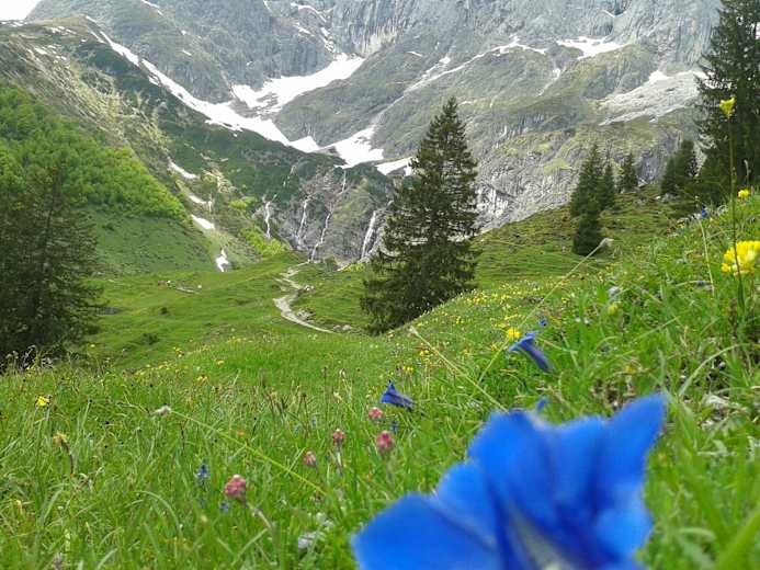Überqueren Sie den steinigen Schrammbach und zweigen Sie links ab falls Sie noch 30 Minuten Ihrer Zeit für ein atemberaubendes Naturschauspiel zur Verfügung haben. Hier gehen Sie ein Stück den Almweg entlang wo Sie die Kühe herzlich Wilkommen heißen. Nun können Sie entspannt den beeindruckenden Wasserfall betrachten. Nach einer kurzen Rast folgen Sie der schmalen Straße hindurch dem kühlen Wald, der Sie an heißen Sommertagen vor der Hitze schützt.