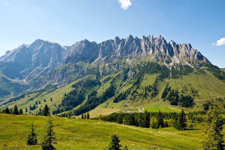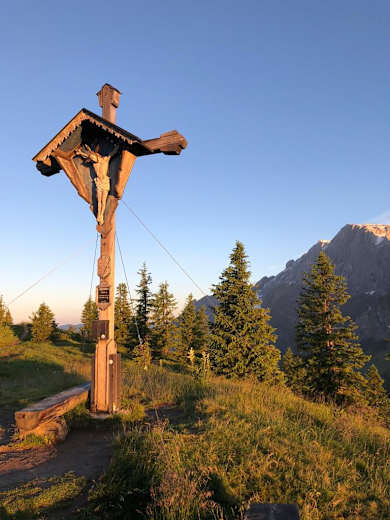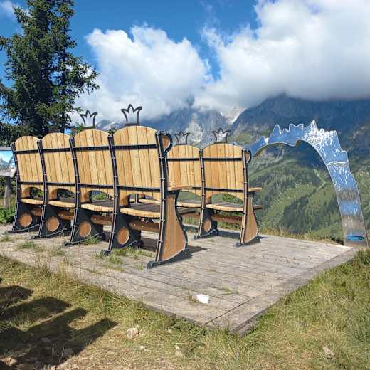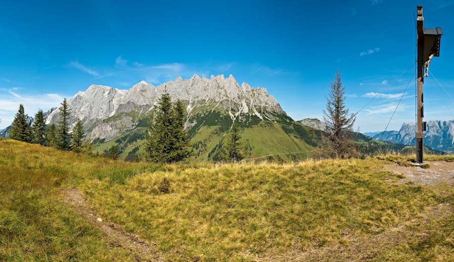Nach drei Kurven stoßen Sie auf eine Kreuzung; biegen Sie nach links ab, um nach wenigen Gehminuten das "Kino am Berg" zu erreichen, das zum Verweilen und Genießen der herrlichen Aussicht einlädt, bevor Sie die letzten Meter zum Hochkeilgipfel wandern. Am Gipfel angekommen, können Sie sowohl Ihren Ausgangspunkt, das Arthurhaus, als auch das komplette Hochkönigmassiv überblicken.