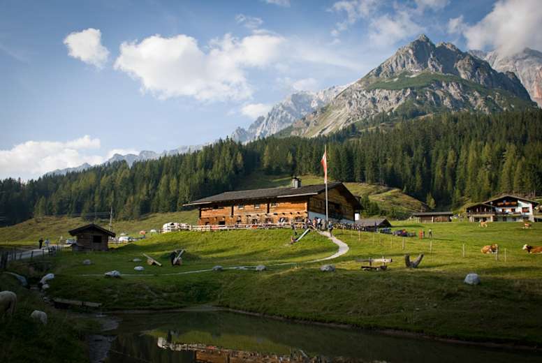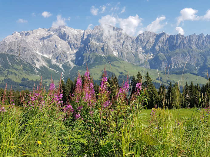 Der Abstieg zum Dientner Sattel und zur Dientalm erfolgt über die Forststraße Nr. 75, und immer wieder können Sie dabei herrliche Aussichten auf den Hochkönig genießen. Bei der Dientalm angekommen, ist ein Blick ins Käseregal mit den hausgemachten Käsespezialitäten ein absolutes Muss. Eine Verkostung ist ebenfalls sehr zu empfehlen. Oder Sie lassen sich von den liebevoll zubereiteten Kräuterspezialitäten der Almleute verwöhnen.