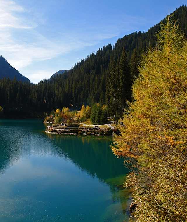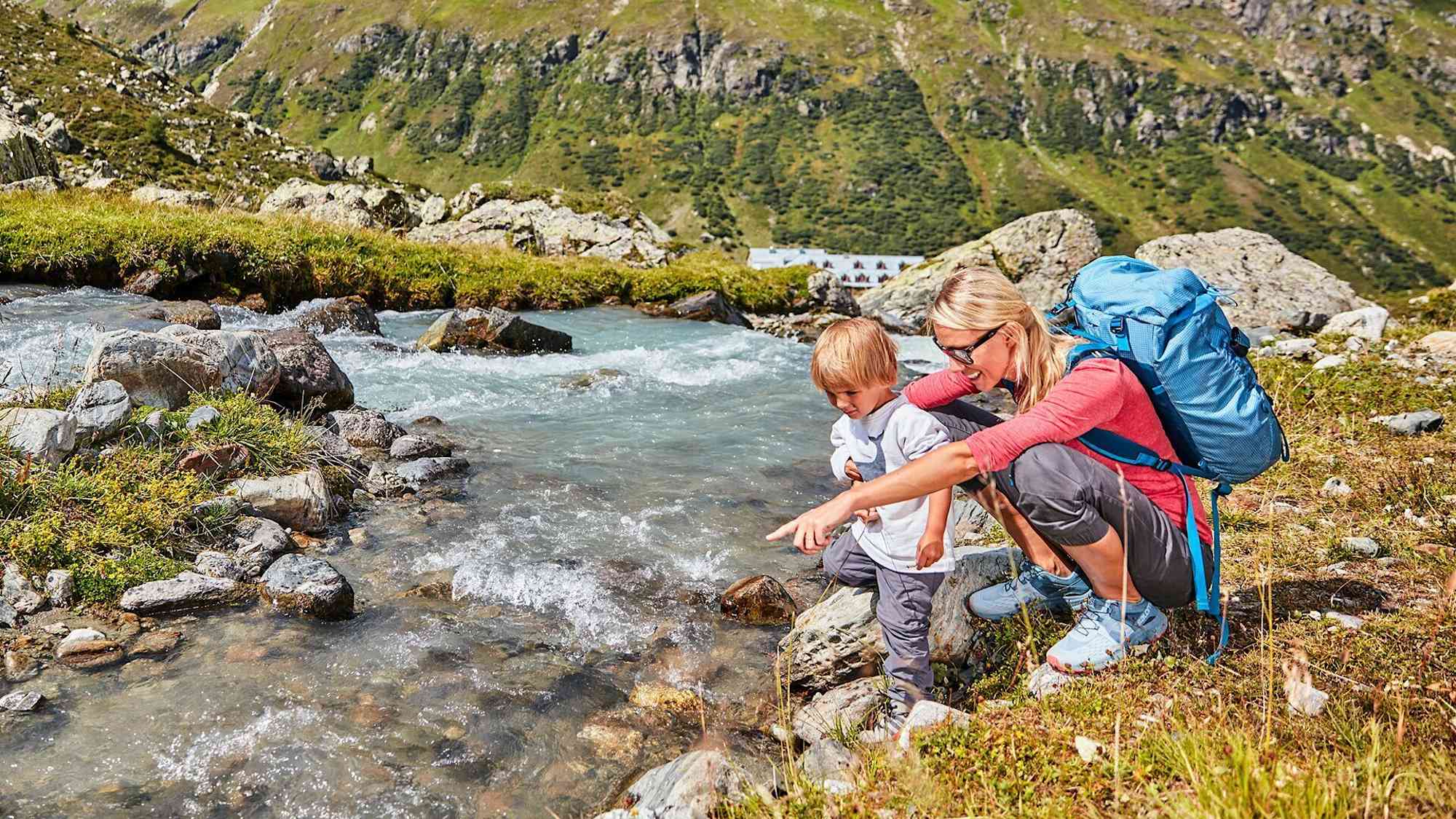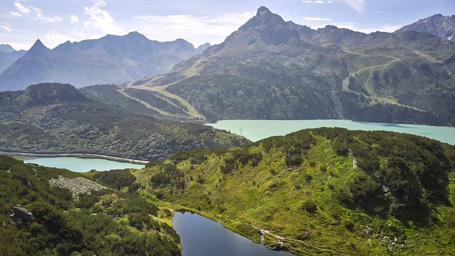 Hier angekommen haben Sie die Wahl: Entweder wandern Sie links über die Staumauer bis zum Kiosk des Kopsstausees oder rechts entlang des Uferweges direkt zum Gasthof Zeinisjoch. Die Passhöhe Zeinisjoch stellt nicht nur die Landesgrenze zwischen Tirol und Vorarlberg dar, hier verläuft auch die Wasserscheide Rhein- Donau.