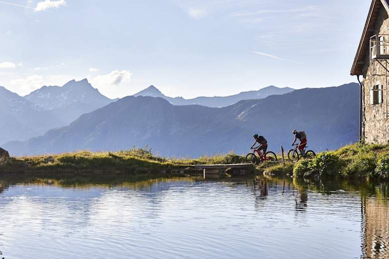 Die Tour beginnt im Dorfzentrum von Ischgl. Fahren Sie mit dem Bike entlang der Paznauntalstraße bis zum Paznaunweg, der über die Trisanna führt. Folgen Sie dem Weg entlang des Talbodens durch Mathon bis Valzur. Ab hier nehmen Sie den Forstweg Richtung Friedrichshafener Hütte (2.138 m). Dieser führt durch den Wald in mehreren Kehren bis über die Baumgrenze. Die Schutzhütte liegt malerisch eingebettet an einem kleinen See und bietet einen fantastischen Ausblick auf die Silvretta und das imposante Fluchthorn. Von hier aus geht es zu Fuß auf einem Fahrweg Richtung Muttenjoch/Heilbronner Hütte weiter. Auf Höhe des Pachtlbachs zweigt der Weg südlich Richtung Adamsberg ab. Entlang des Grieskogelsees geht es immer weiter dem Gipfel entgegen. Nachdem eine mit Seil versicherte Stelle überwunden ist, führt der Weg ohne weitere Schwierigkeiten zum Grießkogel (2.641 m).