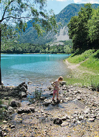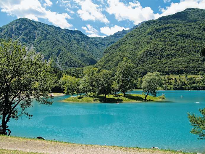 Am malerischen Lago di Tenno. Gute Schwimmer können zur Insel hinüberschwimmen. Foto: Johanna Stöckl, Rosemarie Pexa - Rother ErlebnisUrlaub mit Kindern Gardasee
