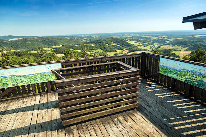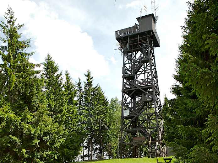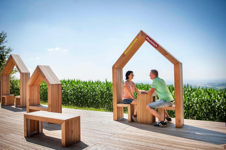 Die Runde beginnt dann über den Brunnenplatz, dann links über die Panoramastraße und den Kurzen Weg. Von da an heißt es rechts halten (immer den Vogelhäuschen entlang), bis man zur Hutwischwarte gelangt. Dort kann über Stufen auf die Plattform erklommen werden, von wo aus man bei schönem Wetter einen 360° Ausblick in 5 verschiedene Staaten hat. Die errichteten Rastbänke eignen sich ideal für eine kurze Pause. Gegenüber der Warte geht der Rundweg weiter und führt in einem schönen Bogen wieder retour zum Ausgangspunkt nach Hochneukirchen. Dort wartet die Konditorei Beiglböck oder das 2023 neu eröffnete Gasthaus s'Hutwisch auf die knurrenden Mägen.