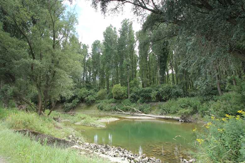Weiter geht es entlang einer alten Pappelpflanzung. Bei der Regelsbrunner Traverse quert man erneut den Seitenarm, auf dem ruhigen Gewässer sind häufig Grau– und Silberreiher, aber auch Gänsesäger, Kormorane und Schwäne zu beobachten. Man erreicht die Ortschaft Regelsbrunn.