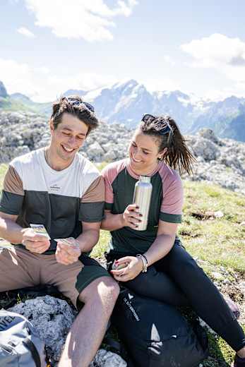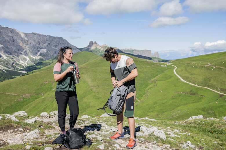 Kurze Pause - auf Etappe 1 der Dolomites Ronda wandert man von der Seiser Alm bis ins Fassatal. Foto: wisthaler.com, Auchenthaler