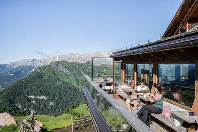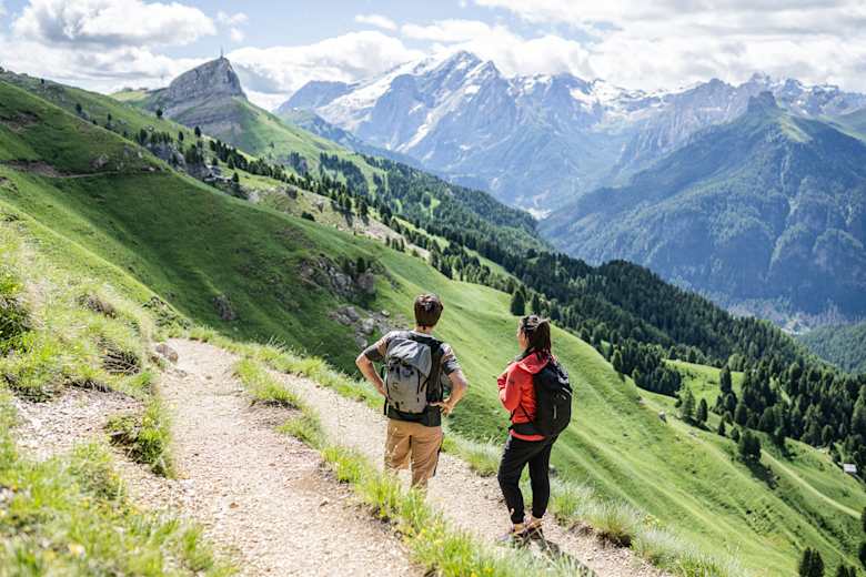 Bequem gelangst du mit dem Almbus nach Saltria, von wo aus du zum Fassa Joch und der Plattkofelhütte auf 2.305 m wanderst. Dort angekommen, richtet sich dein Blick auf die Marmolata (3.343 m), das höchste und einzige mit Gletschereis bedeckte Gipfelmassiv der Dolomiten. Entlang des Friedrich August Weges wanderst du zur Bergstation Col Rodella, von wo aus du mit der Seilbahn nach Campitello di Fassa fährst.