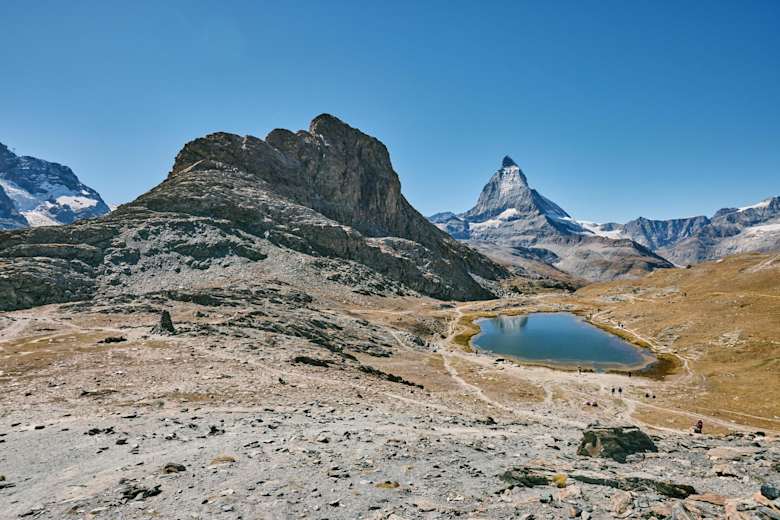 Mit der Gornergratbahn geht es von Zermatt bis zur Bergstation - der Station Gornergrat. Sie liegt auf 3.089 m und bietet von ihrer Aussichtsplattform schon den ersten umwerfenden Blick in die imposante Bergwelt des Wallis. Von der Bergstation folgt man dem Gornergrat 360° Loop aufwärts auf den Hohtälligrat. Nun geht es sehr aussichtsreich, aber auch ziemlich steil abwärts in Richtung Gornergletscher. Trittsicherheit und Achtsamkeit sind hier unbedingt erforderlich. Sich rechts haltend wandert man schließlich direkt auf das Matterhorn zu und erreicht bald darauf den Riffelsee.