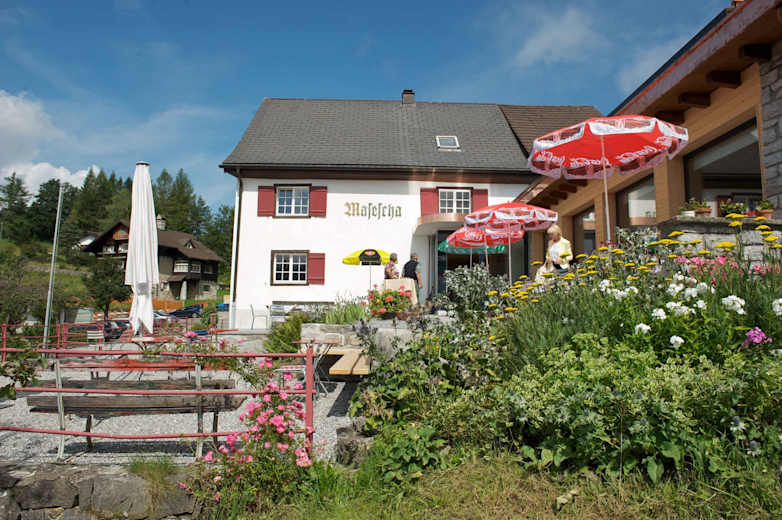 Im Bergrestaurant Masescha lohnt es sich einzukehren und den berühmten gedeckten Apfelkuchen auf der sonnigen Terrasse zu geniessen.