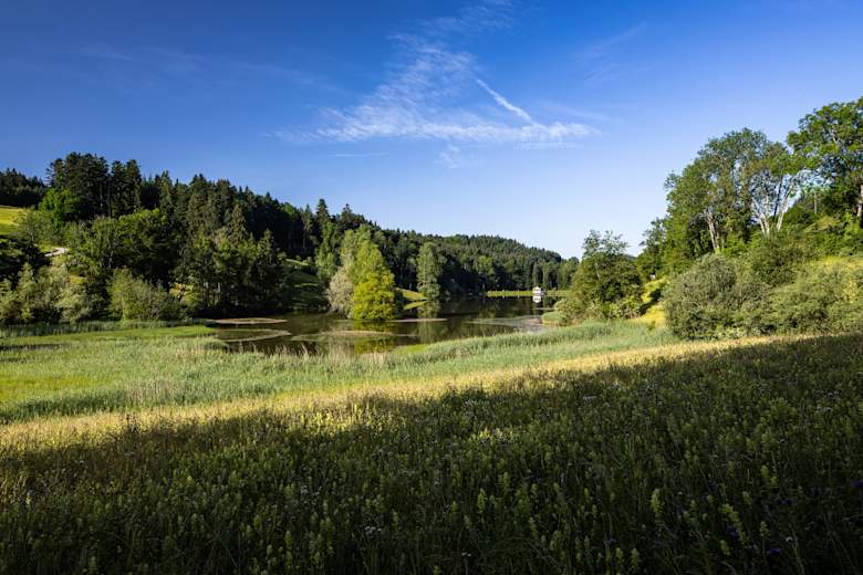 Die Wanderung führt vom Mühleggweier entlang der Badeweiher auf Dreilinden über den Kapfwald zum Wenigerweier.