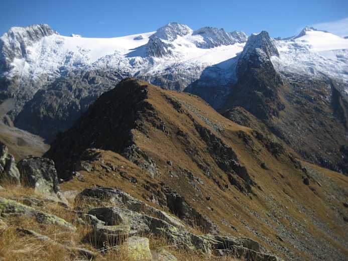 Oben angekommen wird der Blick frei auf den Medelser Gletscher. Der nun folgende Grat ist abwechslungsweise breit und mit Gras und Erika überwachsen, dann wieder anspruchvoll und mit felsigen Passagen durchsetzt. Und es geht dabei mal rauf und mal runter, bis wir endlich beim Punkt 2479, neben dem grossen Steinmann, die Aussicht geniessen können. Die Täler mit Ihren Dörfern und Fraktionen liegen weit unter uns und das 360 Grad Bergpanorama ist eindrücklich gespickt mit schneebedeckten Gipfeln.