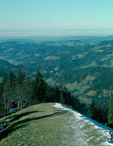Das Gipfelplateau Napf ist mit 1'408 Metern meistens nebelfrei. Zwei Panoramatafeln gegen Norden Süden weisen auf die sprichwörtliche Rundsicht. Ähnlich einem Spinnengewebe verlaufen unzählige Eggen und Gräben in allen Richtungen.