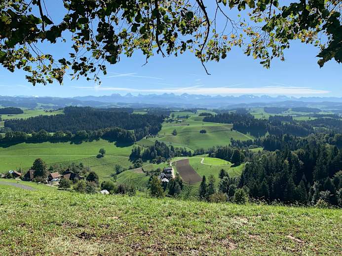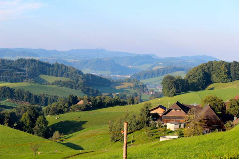 Auf dieser am Hof Schnabel vorüber bis zum nahen Wäldchen. An dessen Nordsaum steigt ein teppichweicher Fussweg zur breiten Hochebene der Weid und mündet in das von Eggerdingen aufsteigende Teersträsschen. Auf diesem ins nahe Dorf Affoltern zur Emmentaler Schaukäserei.
