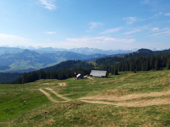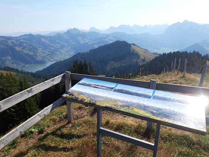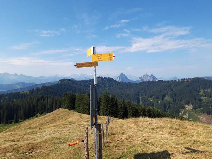 Nehmen Sie den Weg Richtung Regenegg. Im Flachmoor sorgen Holzbrügel für ein gutes durchkommen. Auf der Regenegg 1531 müM ist der zweite Punkt mit wunderbarer Aussicht auf die Ybriger Bergwelt erreicht.