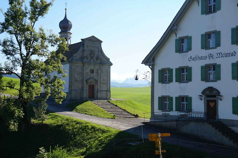 Der Rundweg beginnt und endet beim Gasthaus und der Kapelle St. Meinrad, die als Ensemble im Bundesinventar der schützenswerten Ortsbilder eingetragen sind. Die Kapelle ist dem Heiligen Meinrad geweiht, der hier um 828 gelebt haben soll. Die Geschichte des Gasthauses reicht weit zurück, denn bereits im 14. Jahrhundert stand auf dem Etzelpass ein hölzernes Pilgerhaus.