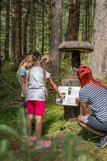 Der „PiLzi“ begleitet durch den Lehrpfad. Wer es schafft, die 3 richtigen Pilze zu finden, kann sich eine kleine Überraschung beim TVB Tourismus Lungau – Infostelle Mariapfarr abholen.