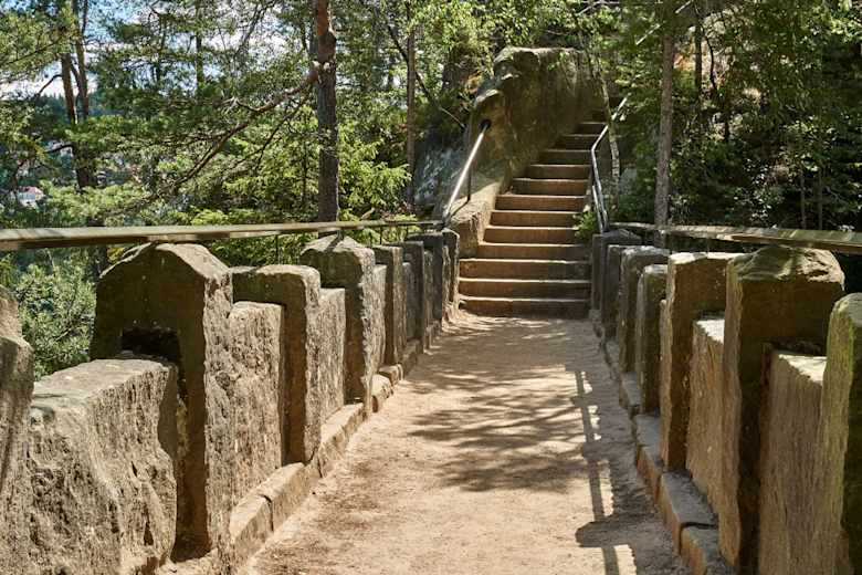 Der Fremdenweg führt uns zu einer der bekanntesten Sehenswürdigkeiten des Elbsandsteingebirges, der Bastei. Von der Basteibrücke und den umliegenden Aussichten bieten sich uns fantastische Ausblicke in die Landschaft. Über Stufen steigen wir den Basteiweg hinab. Von hier aus kann man zur Einkehr in zahlreiche Restaurants nach rechts in den Kurort Rathen gehen, muss aber wieder zurückwandern.
