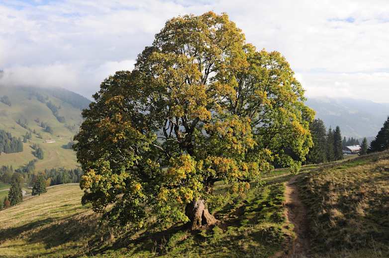 Kurz darauf linksseitig eine stämmige Fichte, unter deren Zweige das Vieh gern Schutz vor Sonne und Regen sucht. Daneben eine knapp 50 Meter hohe Weißtanne, die einem Riesen gleicht. Wir zweigen links ab zur Oberstieg Alpe, wo wir gleich nebenan einen weiteren Baumveteran, nämlich eine stark verästelte Rotbuche, entdecken. Auf dem Bergpfad in Richtung Falkenhütte/Hörmoos dann folgt ein wahrer Bergahorngarten mit mehreren markanten Exemplaren nahe des Weges. Diese werden gerne als Fotoobjekt genutzt.