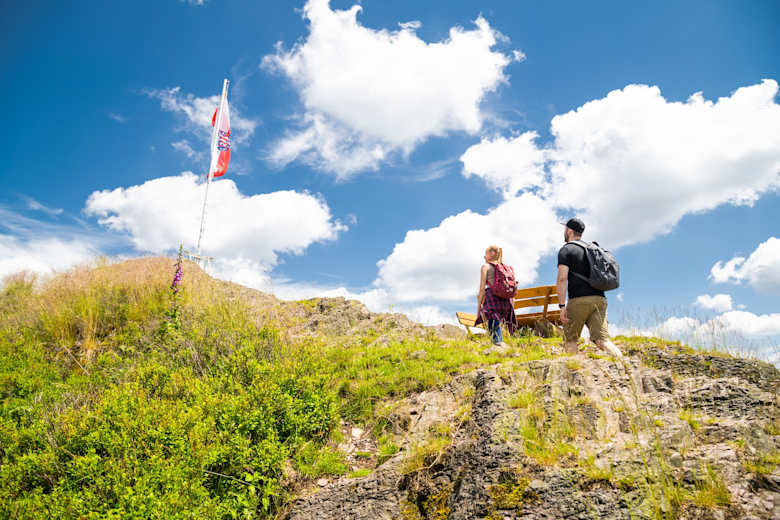 Der Abstieg erfolgt auf gleichem Weg. Am Parkplatz Ruppberg nehmen Sie den Rennsteig-Dolmar Weg zum Heinrichsbacher Stein. Von hier aus können Sie nochmal einen wunderschönen Ausblick genießen. Weiter geht es über den Stachelsrain zurück zum Ausgangspunkt.
