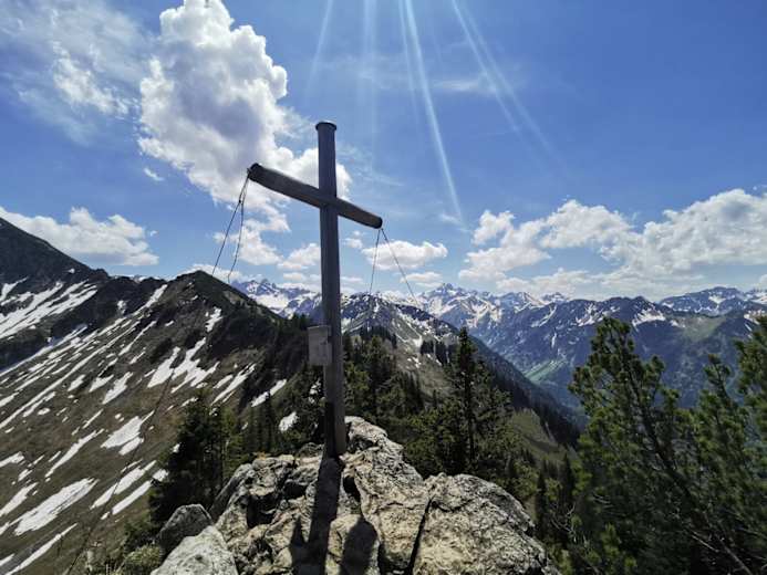 Am Sattel zwischen Riefen- und Hahnenkopf angekommen, führt die Bergtour leicht aufsteigend, nach rechts. Auf blumenreichen Bergwiesen zwischen Allgäuer Latschenkiefern geht es zum Übergang ins Oytal. Hier führt ein kurzer Abstecher entlang des dicht bewachsenen Grates zum Gipfel des Hahnenköpfles. Aufgrund vieler Wurzeln sollte man auf jeden Fall trittsicher sein. Die letzten, gut eingewachsenen Meter auf felsigem Untergrund, erfordern bei leichter Kletterei schon einmal eine Hand zur Hilfe. Vom Gipfel inmitten der Allgäuer Alpen hat man sich den herrlichen Rundumblick vom Nebelhorn bis zum Hauptkamm der Allgäuer Alpen, redlich verdient.