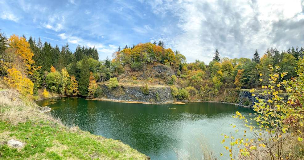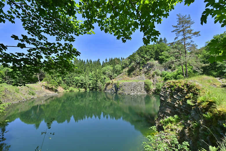 Der Basaltsee Tintenfass zeugt vom Bergbau am Farnsberg. Eine alte Lok und die Umlenkstation zeugen noch heute vom Basaltabbau in der Rhön.