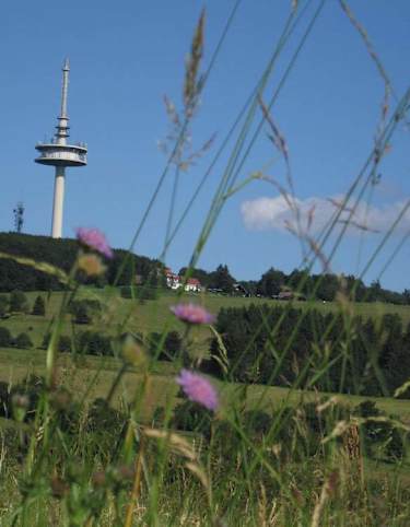 Die Tour führt uns weiter zum Rösberg (400 m), von dem sich ein Panoramablick über Hünfeld und die Stadtteile Großenbach und Kirchhasel öffnet. Der Weg führt weiter durch Rhön-typische Magerrasen und vorbei an kleinwüchsigen Kiefern zurück zum Ausgangspunkt - dem Haselsee.