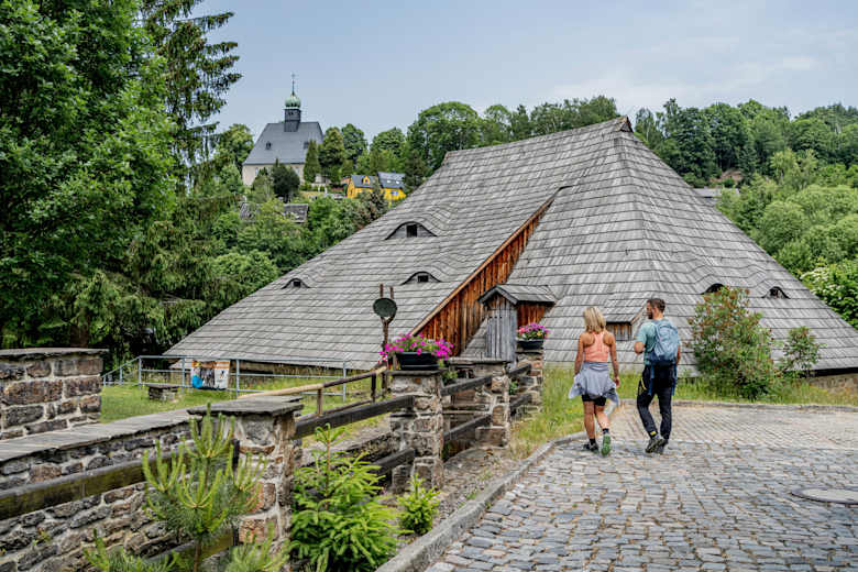Gute Kondition ist nun gefragt, denn der Kammweg verläuft ansteigend bis zum Zechenweg. Nun gehen wir oberhalb von Oberneuschönberg entlang des Tiefen Grabens durch Nadelwald weiter bergauf. Ganz in der Nähe befindet sich der Gnade-Gottes-Erbstolln. Wer mag, kann sich dieses sehenswerte Bergbauzeugnis anschauen. Ein Stück auf dem Sagenweg "Der Hüttenmatths" und an saftigen Viehweiden entlang, führt uns der Kammweg über den Kirchweg an der Bergkirche vorbei nach Grünthal zum europaweit einmaligen Museumskomplex der Buntmetallurgie – der Saigerhütte. Der Hüttenbetrieb wurde 1537 zum Entsilbern von Rohkupfer mittels des Saigerverfahrens gegründet. Der mehrstufige Schmelzprozess galt über Jahrhunderte als Spitzenleistung des Hüttenwesens. Besonders begehrt war das Grünthaler Dachkupfer, das über 400 Bauwerke in Europa schmückte, wie z. B. die Dresdner Frauenkirche, das Ulmer Münster und den Stephansdom in Wien.