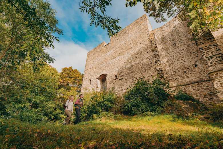 Über die Straße kommen Sie bereits nach wenigen Metern zu den Burgsteinruinen, ehemalige Wallfahrtskirchen der Bistümer Naumburg und Bamberg, deren Bistumsgrenzen über dem Burgstein verliefen. Von hier führt Sie der Kammweg am Waldrand zum Burgbach und durch den Wald in das wildromantische Kemnitzbachtal. An der Kienmühle finden Sie die erste Rastmöglichkeit. Die stillgelegte Mahl- und Schneidmühle gehört zu den letzten ihrer Art in der Region. Auf dem Kammweg im Kemnitzbachtal müssen Sie gefasst sein auf herrlich verwachsene Pfade, wurzlige Waldwege und immer das sanfte Rauschen des Kemnitzbaches als Hintergrundgeräusch.