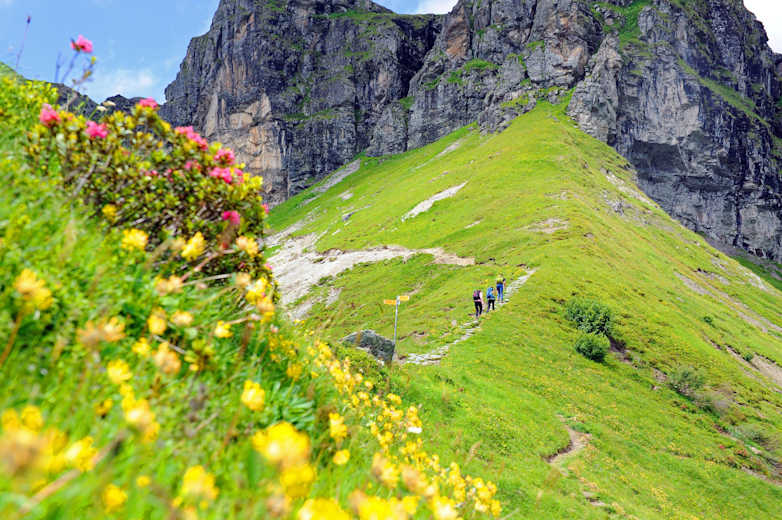 Nun beginnt der Abstieg: Nach kurzer Zeit sehen Sie den Chüebodensee. Zuerst auf schmalem Weg, dann auf einem Alpweg geht wandern Sie hinunter zur Oberen Ämpächli Alp. Ab hier geht es auf schönem Weg nach Unter Ämpächli. Bei guter Sicht können Sie gegenüber sogar das berühmte Martinsloch im Weltnaturerbe Sardona erblicken.
