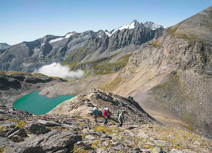 Über steile Wiesen geht es vom Glocknerhaus (2.132 m) hinauf zur Pfandlscharte. Mit dem Anstieg zum Spielmann, dem ersten Dreitausender der Tour, hat man endgültig die karge Fels-Landschaft des Hochgebirges erreicht. Von dort folgt man dem Felsgrat nach Osten, wo entlang von Seilsicherungen auch Trittsicherheit gefragt ist.