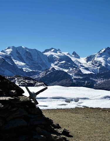 Über einen sprudelnden Bergbach gelangen wir auf das Gebiet der Corviglia, dem St. Moritzer Hausberg. Dort führt unser Weg zunächst vorbei am mondänen Bergrestaurant El Paradiso sowie an der Bergstation der Sesselbahn Chasellas und steigt dann an bis hinauf zur Bergstation Corviglia auf über 2400 m ü. M.. Hier gilt es, noch einen vorerst letzten steilen Anstieg zu bewältigen, bis der tiefblaue Naturspeichersee Lej Alv zu unseren Füssen liegt.