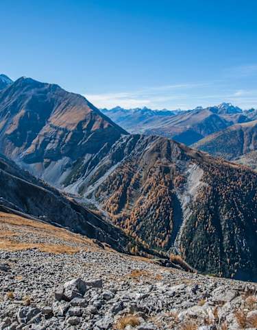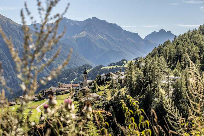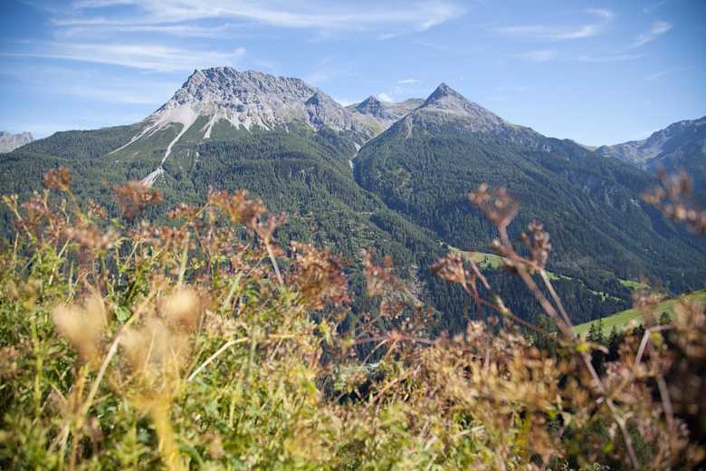 Tschlin, hoch über dem Inn auf einer Sonnenterrasse gelegen, zählt zu den schönsten Dörfern der Schweiz. Von hier aus verläuft die Wanderung über einen Kiesweg hinaus nach Prà Grond. Weiter geht es über offenes Gebiet zu den Wiesen von Mundaditsch immer schön geradeaus durch den Wald. Der Weg führt weiter über eine Aussichtskuppe auf einem Wiesenpfad nach Vadrain. Hier kann man das wunderbare Panorama über die Unterengadiner Bergwelt geniessen.