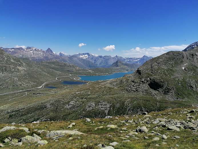 Gemütlich schlendernd am Lago Bianco entlang, beginnt diese Etappe. Hinter der Staumauer mündet der Weg in einen breiten Alpweg vorbei am Lej Nair und Lej Pitschen. Auf der Höhe des Lej Pitschen ist es vorbei mit der Gemütlichkeit. Der Weg zweigt links ab und steigt über Alpwiesen hoch zum Lej d'Arlas und danach im steileren Gelände zum Lej da Diavolezza.