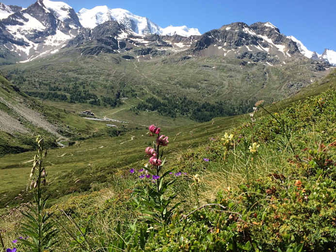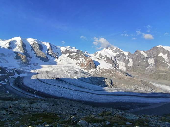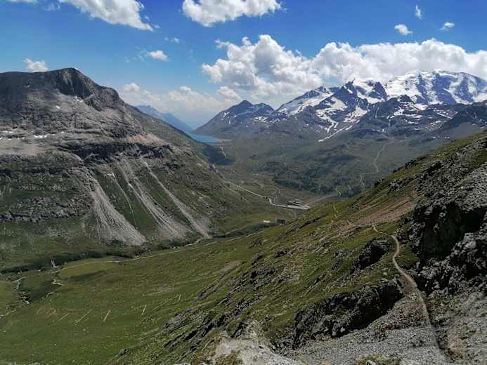 Gönnen Sie sich nochmals einen letzten Blick auf das grandiose Bergpanorama, denn so nah kommen Sie auf den weiteren Etappen nicht mehr an das Berninamassiv heran.