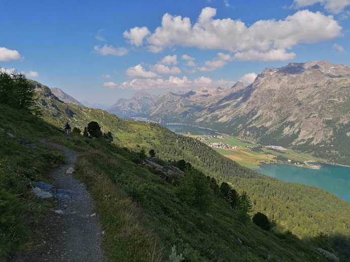 Von Surlej fährt die Corvatschbahn wieder hinauf zur Mittelstation Murtèl, wo diese Etappe beginnt. Kurz aber steil geht es runter, bevor der Wanderweg am Hang entlang zur Alp Prasüra führt, immer in Begleitung einer traumhaften Aussicht auf die blauen Seen des Oberengadins. Bei der Alp Prasüra sticht dann der Weg runter ins Dorf Sils, welches entlang der schönen Engadinerhäuser durchquert wird. Bei der Kirche San Lurench in Sils Baselgia wird die Hauptsrasse überquert und dann geht es auf der Via Engiadina zuerst durch einen schönen Lärchenwald und danach aufsteigend zum Aussichtspunkt bei Muotta. Die Bank kommt wie gelegen für eine Rast und das Geniessen der Aussicht von den Bergeller Granitbergen bis rüber auf Muottas Muragl.