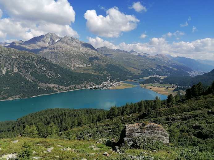 Ein kurzer Abstieg führt ins Dorf Grevasalvas, wo einer der ersten Heidifilme gedreht wurde. Weiter führt eine Fahrstrasse hoch nach Blaunca, im Blick der Piz Lunghin, wo der Inn entspringt und im Rücken die Aussicht auf den Silsersee. Bei Plan di Zoch führt der Wanderweg runter nach Maloja dem Endpunt dieser aussichtsreichen Weitwanderung.