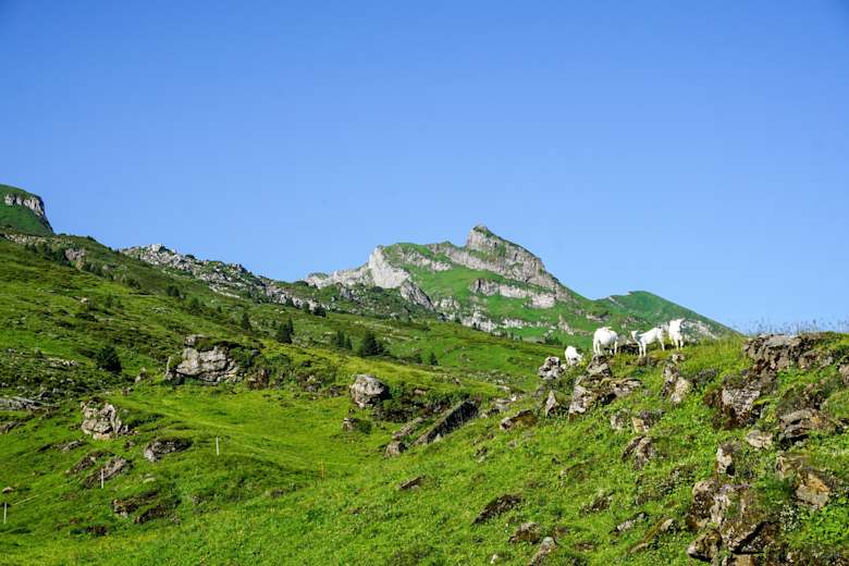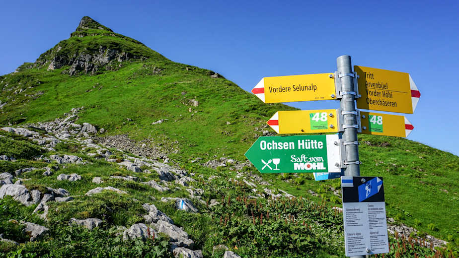 Kein Glück, sondern nur ein aufmerksames Auge braucht’s, um die kleinen Bergeinschnitte und Schluchten zu sehen, unter denen so mancher unterirdische Bach verläuft. Speläologen haben in den letzten zwei Dekaden allein im Gebiet des Gamserruggs und des Chäserruggs über 150 Höhlen entdeckt – einige davon mehrere Hundert Meter tief. Das säurehaltige Regen- und Schmelzwasser sich über Jahrtausende seinen Weg durch den Schrattenkalk gefressen. Kurz nach der Ochsenhütte weist eine Informationstafel auf diese spektakuläre „Unterwelt“ hin.