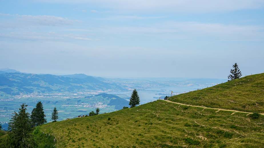Hier werden Schweizer Klischees bedient! Von liebevoll gepflegten Häusern und Gärten, präzise gestapelten Scheiterbeigen, perfekt unterhaltenen Wanderwegen und minutengenauen Zeitangaben auf Wanderwegweisern. Zuerst einmal geht es heute bergab. Anfangs moderat, dann etwas steiler. Für einen frühen ersten Zwischenstopp mit Nussgipfel und Kafi bietet sich die Hütte Oberbächen an. Landschaftlich wunderschön gelegen, mit privilegierter Aussicht zurück auf die bereits geschaffte Strecke, und voraus auf den Weg, der noch vor einem liegt. Und der führt schon bald in das kleine Dorf Ricken. Auch wenn es nur ein paar Hundert Einwohner zählt – nach drei Tagen endloser Ruhe in den Bergen erscheint einem das Dorfleben bereits als geschäftig.