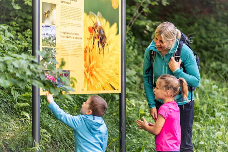 Der Bienenweg in Trens bei Sterzing im Südtiroler Wipptal bietet einen einladenden Einblick in die Welt der Bienen. Er erläutert die Unterschiede zwischen Königin und Drohne und erklärt, warum Bienen für die Kulturlandschaft unverzichtbar sind. Zudem erfährt man, dass Bienen für die Produktion von 1 kg Honig eine Strecke von 150.000 km zurücklegen müssen. Aufschlussreiche Schautafeln entlang des Weges beantworten diese und viele weitere Fragen.