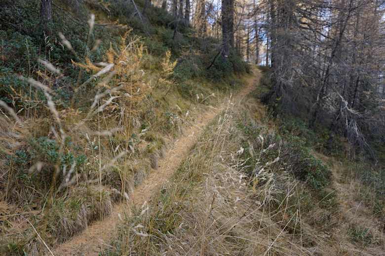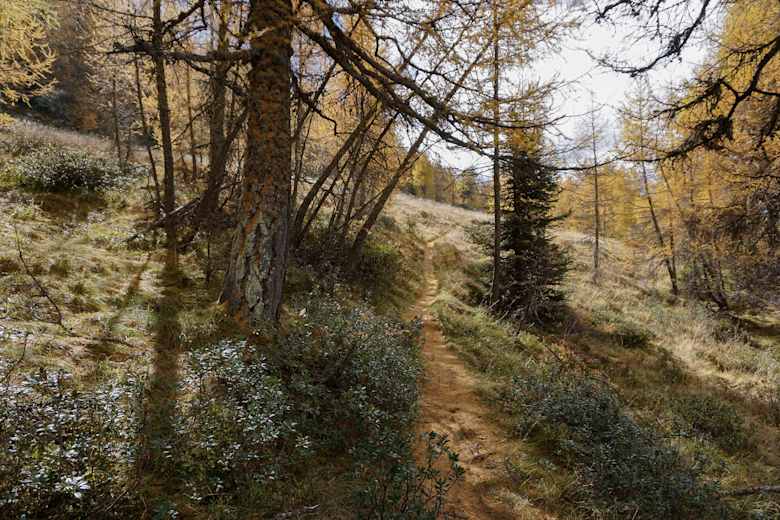 Am Steig im Lärchenwald geht’s hoch zum Saun/Sommo. Foto: Matthias Knaus