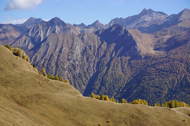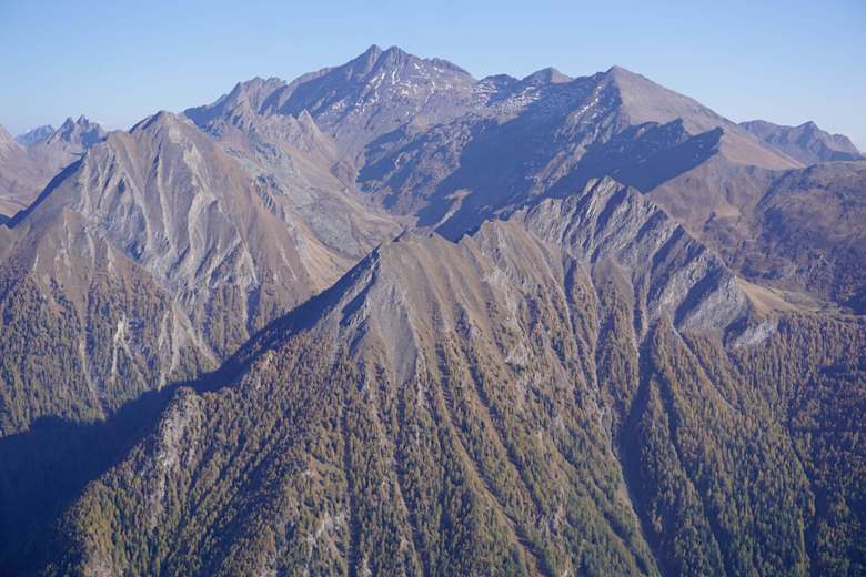 Blick zurück über den begangenen Bergkamm. Der Saun/Sommo ist die letzte waldfreie Erhebung über den Lärchen. Foto: Matthias Knaus