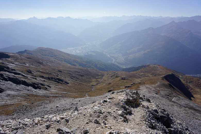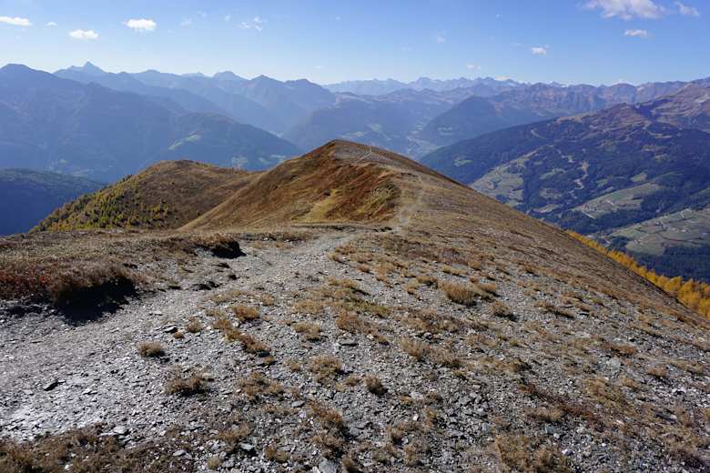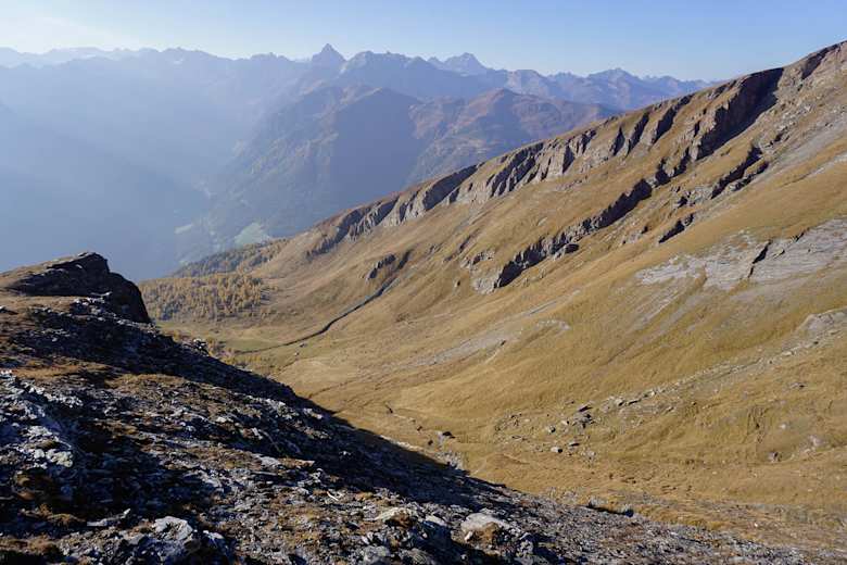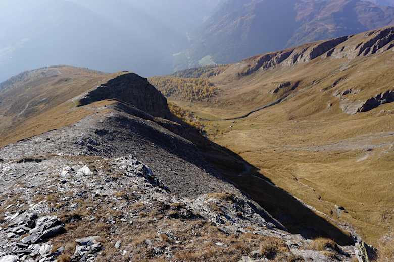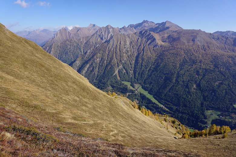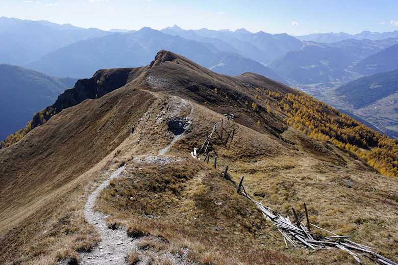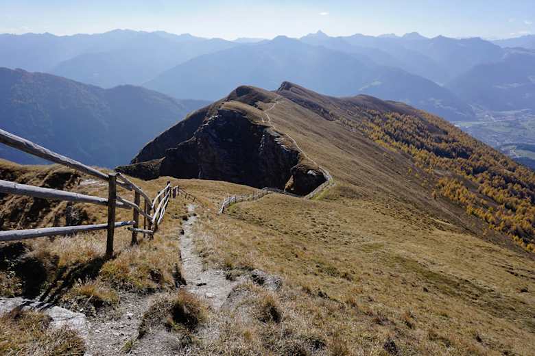 Über den Rücken rechts verläuft die Abstiegsroute zur Riedbergalm (sichtbar). Im herbstlichen Dunst liegt Sterzing. Foto: Matthias Knaus