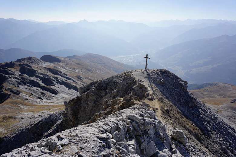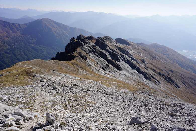 Der Gipfelbereich des Saun/Sommo (2.078m). Ab hier ist das Panorama weit und uneingeschränkt pittoresk. Wieder erkennt man den Gipfel der Weißspitze/Punta Bianca deutlich. Foto: Matthias Knaus