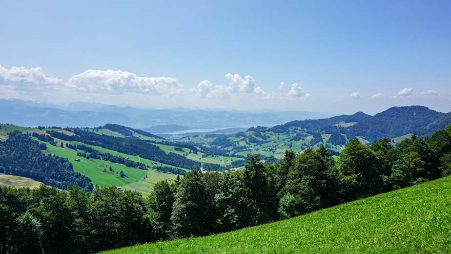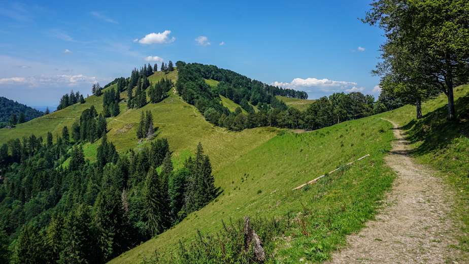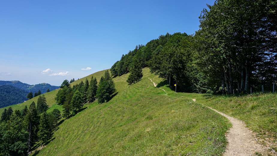 Auf dem rund fünf Kilometer langen Grat zwischen Tweralpspitz und Schnebelhorn taucht man immer wieder ein in Tannenwälder, durch die sich der wenig anspruchsvolle Wanderweg schlängelt. Überhaupt legt man auf dieser Tagesetappe vergleichsweise wenige Höhenmeter zurück und kann – wann immer der Weg wieder auf einen kleinen Gipfel oder Hubel führt – sich die Zeit nehmen, um den Ausblick zu geniessen. Meditatives Wandern – das funktioniert auf der Strecke zum Tagesziel auf der Hulftegg (953 m) wunderbar.
