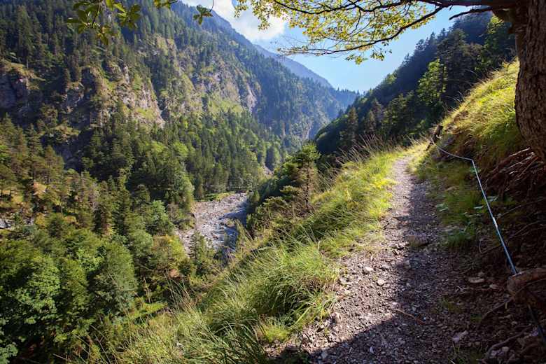 Die Samina ist die Seele der Liechtensteiner Alpengewässer. Am Weiler Steg, wo seit alters der erste Steg den Fluss überbrückt, wird sie aufgestaut. Von der Bushaltestelle Steg Tunnel leiten die Markierungen kurz längs der Strasse über die Brücke vor das Tunnelportal und zeigen dort rechts auf die Bödastrasse, einen Almweg, der beim Bödastall endet. Hier beginnt der eigentliche Bergwanderweg, der bis zur Grenze durchgehend westlich des Flusses verläuft: über den Sulzboden hinunter zum Kaufbödele und dann entlang der linken Bachseite zur Mündung des auf der gegenüberliegenden Talseite herabgiessenden Valorschbachs. Am Falleck zu Füßen des Drei-Schwestern-Massivs wechselt der Weg nach Vorarlberg und verwandelt sich in einen bequemen Forstweg (gelb-weisse Markierung) in der wildromantischen Schlucht. Dann verlässt der Wanderweg die Samina und leitet hinauf ins Höhendorf Amerlügen in Österreich auf einer aussichtsreichen Terrasse des Vorderälpeles.